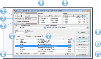 På detta sätt kan en rapport skapas av strukturen och följas med utgångspunkt från den aktuella huvudprodukten. Se även avsnittet Utskrifter Administration för utskrift av strukturer. |