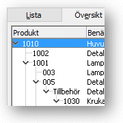 Under översikt på andra fliken visas utöver de registrerade detaljerna under huvudprodukten, även detaljer som i sin tur tillhör detaljprodukterna i flera nivåer. Översikten består av en trädstruktur där roten utgör själva huvudprodukten. Varefter detaljer registreras på huvudprodukten, kommer dessa att återfinnas i nivån direkt under roten. Om dessa detaljprodukter innehåller detaljer, kommer dessa att visas i nästa nivå o.s.v. På detta sätt kan hela strukturen följas med utgångspunkt från den aktuella huvudprodukten. |