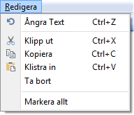 Text som registreras i fält i Winbas kan redigeras med hjälp av funktionerna som finns under Redigera på menyraden. Man kan också använda nedanstående kortkommandon för funktionerna. Den text som ska klippas ut eller kopieras måste först markeras.