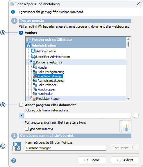 Till vänster om genvägens namn visas den ikon som kommer att representera genvägen på Winbas skrivbord. Ikonen baseras på vilket program filen är associerad till. |