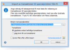Inläsning av data från fil skapad i t.ex. Excel med transaktioner för specialprislistor. Filen ska innehålla nummer som refererar till redan registrerade specialprislistor och nya transaktioner kommer då att använda inställningar som är gjorda för specialprislistan. |