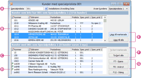 Den översta listan visar de kunder som inte har den aktuella specialprislistan registrerad på sig. Ur denna lista kan kunder väljas in till specialprislistan. Genom att flytta ner kunder från denna lista, läggs dessa till prislistan.