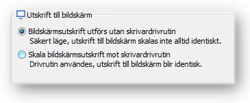 I en miljö där utskrifterna betraktas som driftsäkra kan inställningen Skala Bildskärmsutskrift mot skrivardrivrutin användas för att uppnå identiska utskrifter till både bildskärm och skrivare.