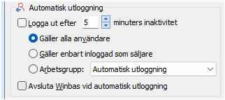 Alternativet Avsluta Winbas vid automatisk utloggning kan då t.ex. användas för att säkerställa att Winbas är avstängt t.ex. när dagen är slut i en Terminal Server miljö eller när backup-rutiner som inte klarar öppna filer används.
