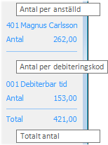 Därefter visas summa antal per vald debiteringskod, som beroende på enhet kan vara t.ex. summa antal timmar. Om alternativet Visa enbart tidrapporter för inloggad användare är valt, avser summan antal av debiteringskoden på den aktuella användaren. Genom att skifta mellan registrerade rader med olika debiteringskoder visas summan av den aktuella debiteringskoden. Längst ner visas totalsumman av alla registrerade antal som en kontroll på allt som har registrerats. |