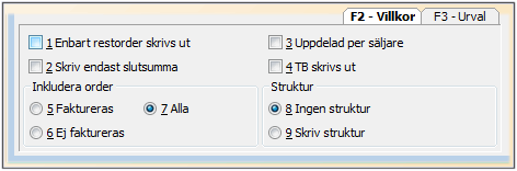 Följande urval kan göras under fliken Urval, anges inget urval skrivs alla inneliggande order ut enligt standardförslag.