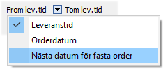 Välj först ordertypen reserverad för fasta order. Växla därefter urvalet från Leveranstid till Nästa datum för fasta order och ange ett intervall för datum, kopplade till registrerade datum för fasta order. |