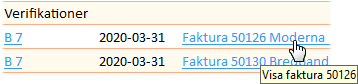 T.ex. kan kundfakturor eller lagrade leverantörsfakturor öppnas direkt från rapporten där dessa förekommer, t.ex. i avsnitten Ej bokförda kundfakturor och Ej bokförda levfakturor - eller när de finns med i en verifikation (enligt figuren).