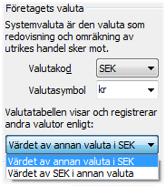 Notera att inställningarna Värdet av annan valuta i systemvalutan och Värdet av systemvalutan i annan valuta vid omvänd valutatabell inte påverkar den bakomliggande matematiken i systemet eller datalagringen i databasen. Detta till skillnad från de flesta andra inställningar som t.ex. inställningen för själva systemvalutan. Inställningen kan därför när som helst förändras efter en tids körning med t.ex. systemvalutan EUR.