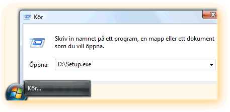 Starta Setup.exe som är själva installationsprogrammet från CD-skivan genom att ange enhetsnamnet och Setup.exe, alternativt välj Bläddra.