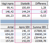 Använd funktionen för att kontrollera produkternas vägda inpriser mot medelvärdet av tidigare inlevererad statistik. Via funktionen är det då möjligt att jämföra och eventuellt förändra det vägda inpriset mot det statistiska värdet.
