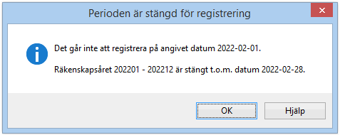 Om försök till registrering görs på en stängd period kommer ett meddelande om detta att visas.