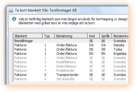 Dialogen ger även en överblick över vilka blanketter som finns skapade i företaget. Om en blankett inte finns i ett språk med en viss språkkod kommer blanketten enligt standardspråket (SE) att användas vid utskriftstillfället. Detta innebär i sin tur att borttagning av en blankett på en annan språkkod som används kommer att generera en blankett enligt standardspråket (SE). Detta kan också vara tillämpligt när man har använt speciella språkkoder för att få ett en specifik design till en viss kund och förfarandet inte längre används, man slipper alltså riskera att den gamla designen används för kunder vars språkkoder inte har förändrats.