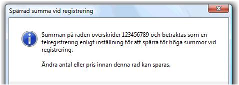 Om ett värde är angivet i inställningen kan spärren aktiveras i samband med registrering av transaktioner i Offertregistrering, Order / faktura eller i Kassa. Dialogen visas när summan överskrider (eller underskrider) det angivna värdet omräknat till systemvalutan (SEK) och innebär att raden inte kan sparas förrän summan har påverkats t.ex. genom att ange ett lägre antal på raden.