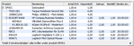 Produkten visas i första kolumnen och indraget efter +/- symbolerna indikerar den relativa nivån när strukturen består av flera nivåer. Vid större strukturer kan symbolerna användas för att dölja underliggande detaljer för produkten.
