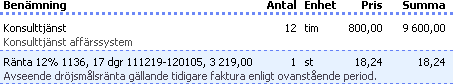 Den produkt som är angiven i Inställningar Räntefakturering kommer att användas på fakturan. Benämningen på produkten kan t.ex. sättas till "Ränta" eller liknande och benämningen på själva fakturablanketten kommer att ersättas med en automatiskt genererad text innehållande t.ex. Räntesats, Fakturanr, Antaldagar, Förfallodatum, Betalningsdatum och Betalt belopp registrerat på räntetransaktionen.